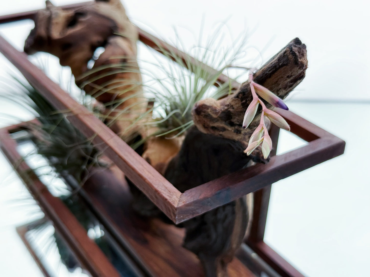 Each AirBonsai lovingly frames a Tillandsia (air plant) in a handcrafted design featuring rich Kiaat hardwood, a slender brass rod for a touch of refined contrast, and a unique piece of driftwood—each one shaped by the elements, each one entirely one of a kind.