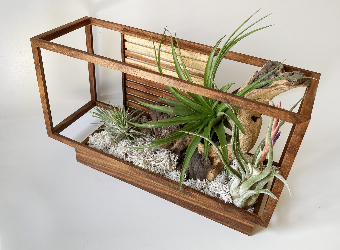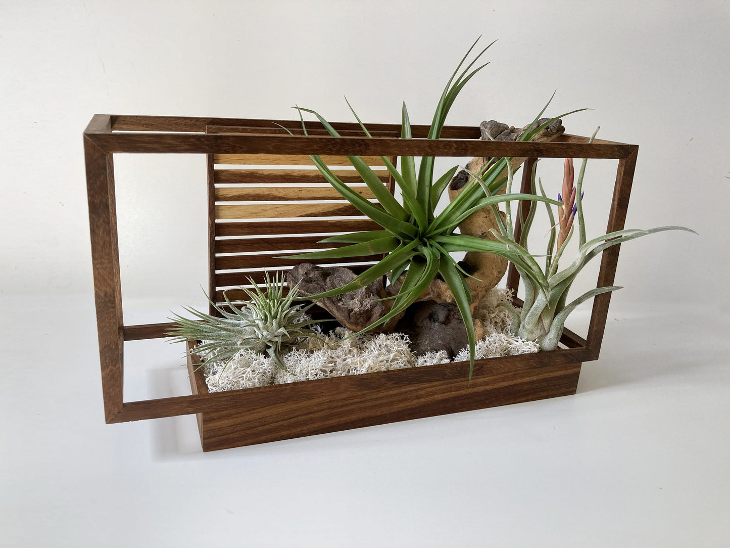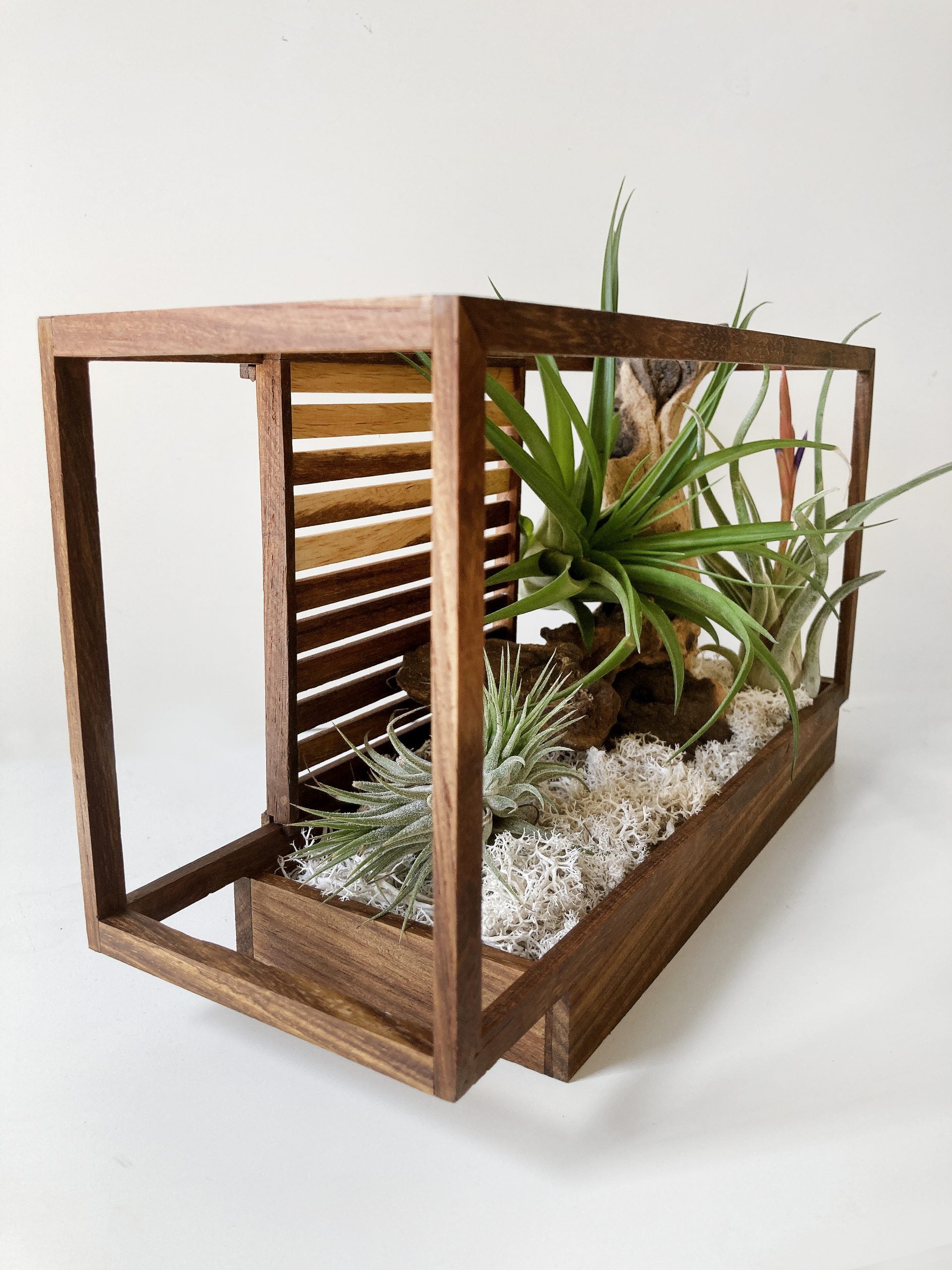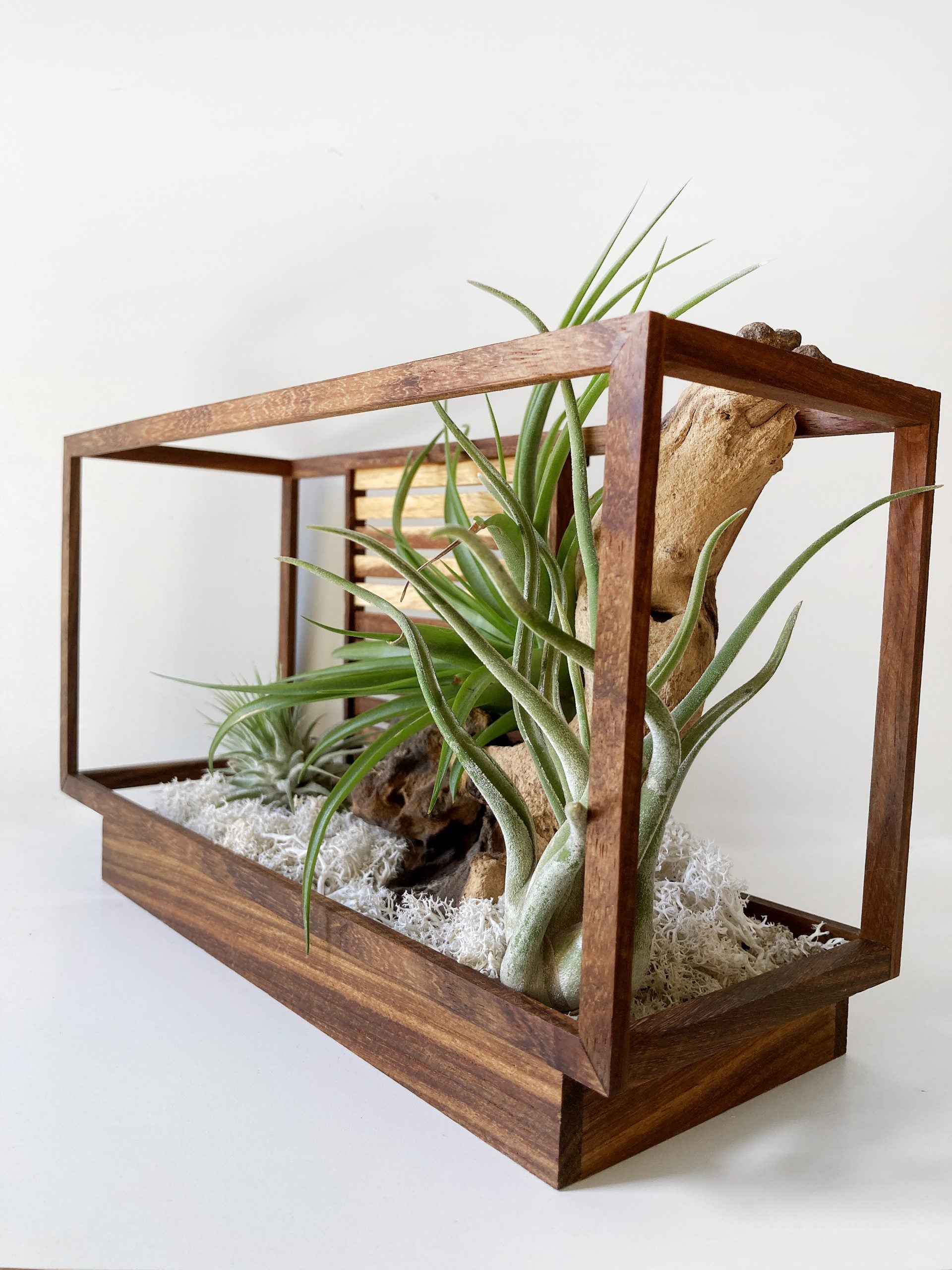 Inspired by the clean geometry of container house design, this piece is handcrafted from rich Kiaat hardwood—valued for its warmth, strength, and refined character. The design offers a grounded base from which your Tillandsia (air plant) gently rises, bringing a touch of natural elegance to architectural form.