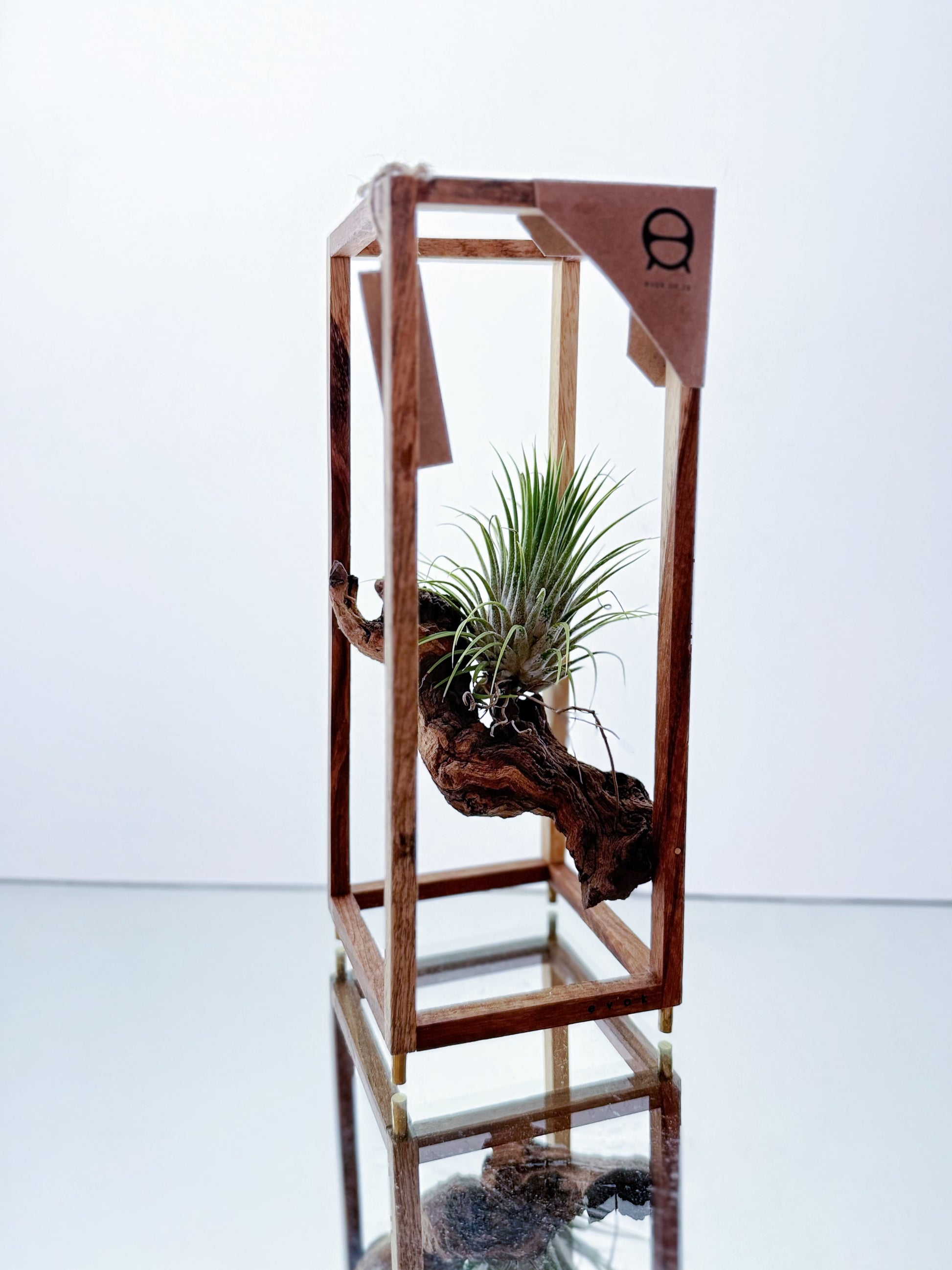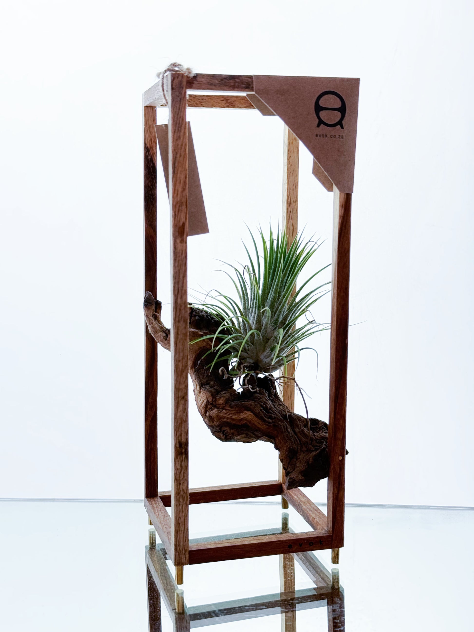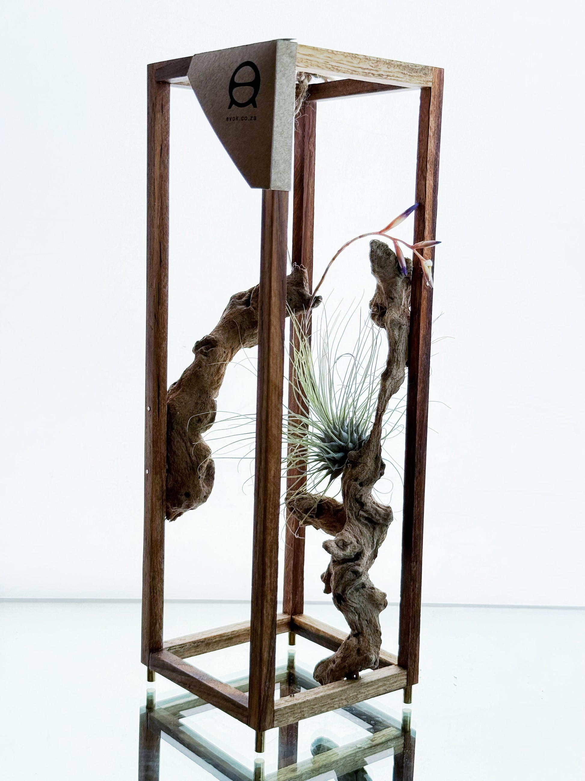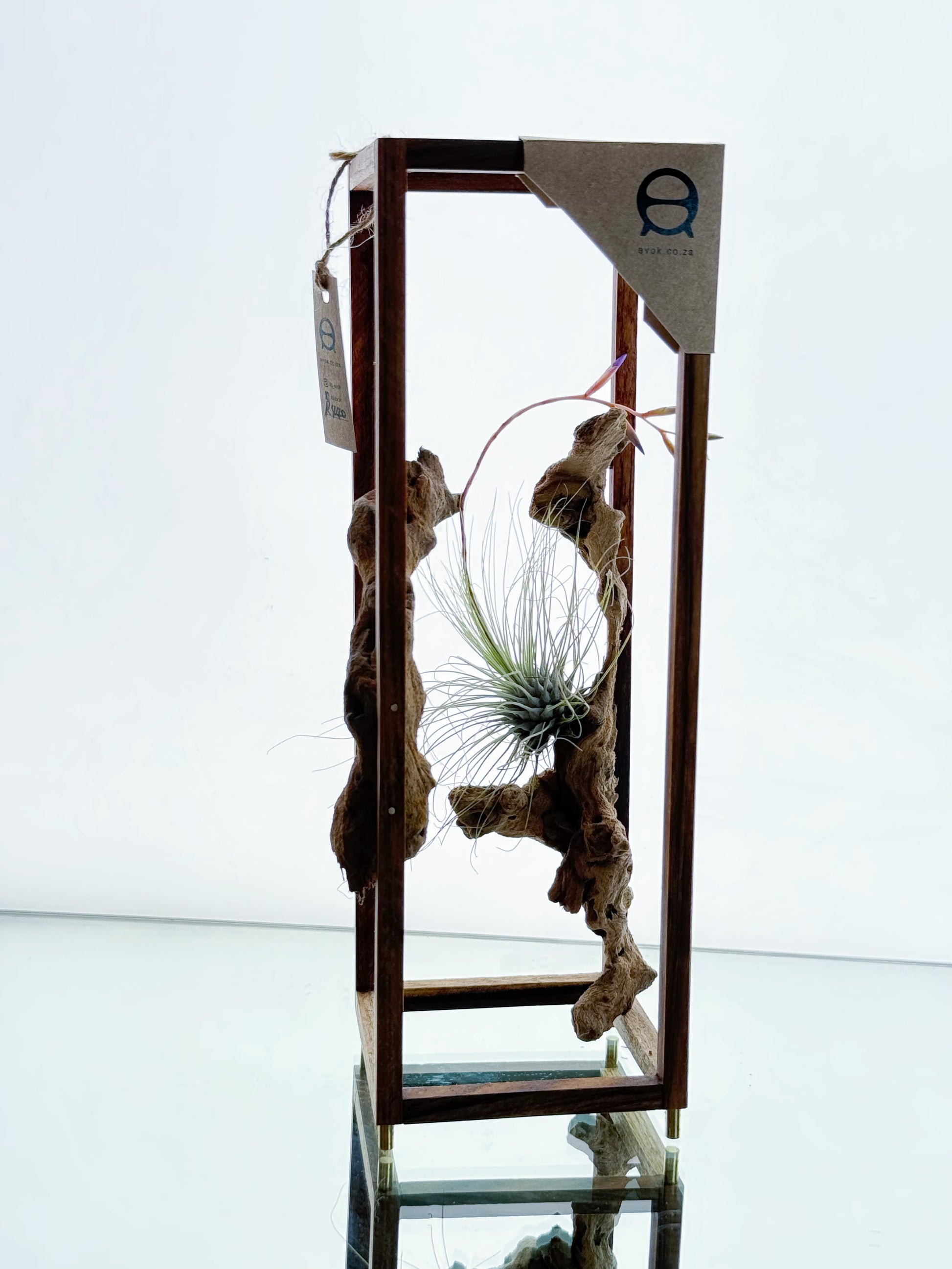 Each piece lovingly frames a Tillandsia (air plant) in a handcrafted structure made from rich Kiaat hardwood, a brass rod for elegance, and a unique driftwood centerpiece—each one telling its own story from land and sea.