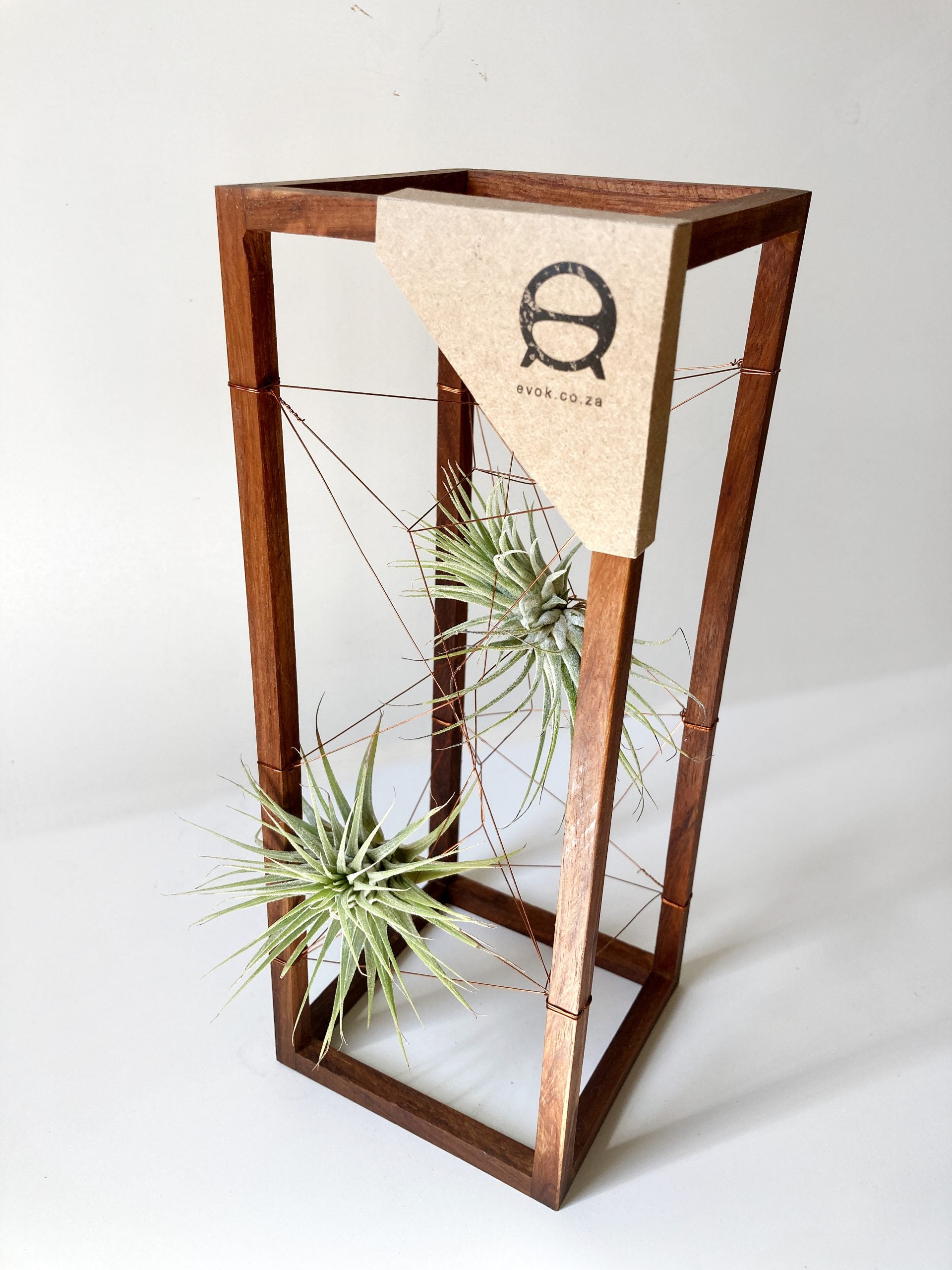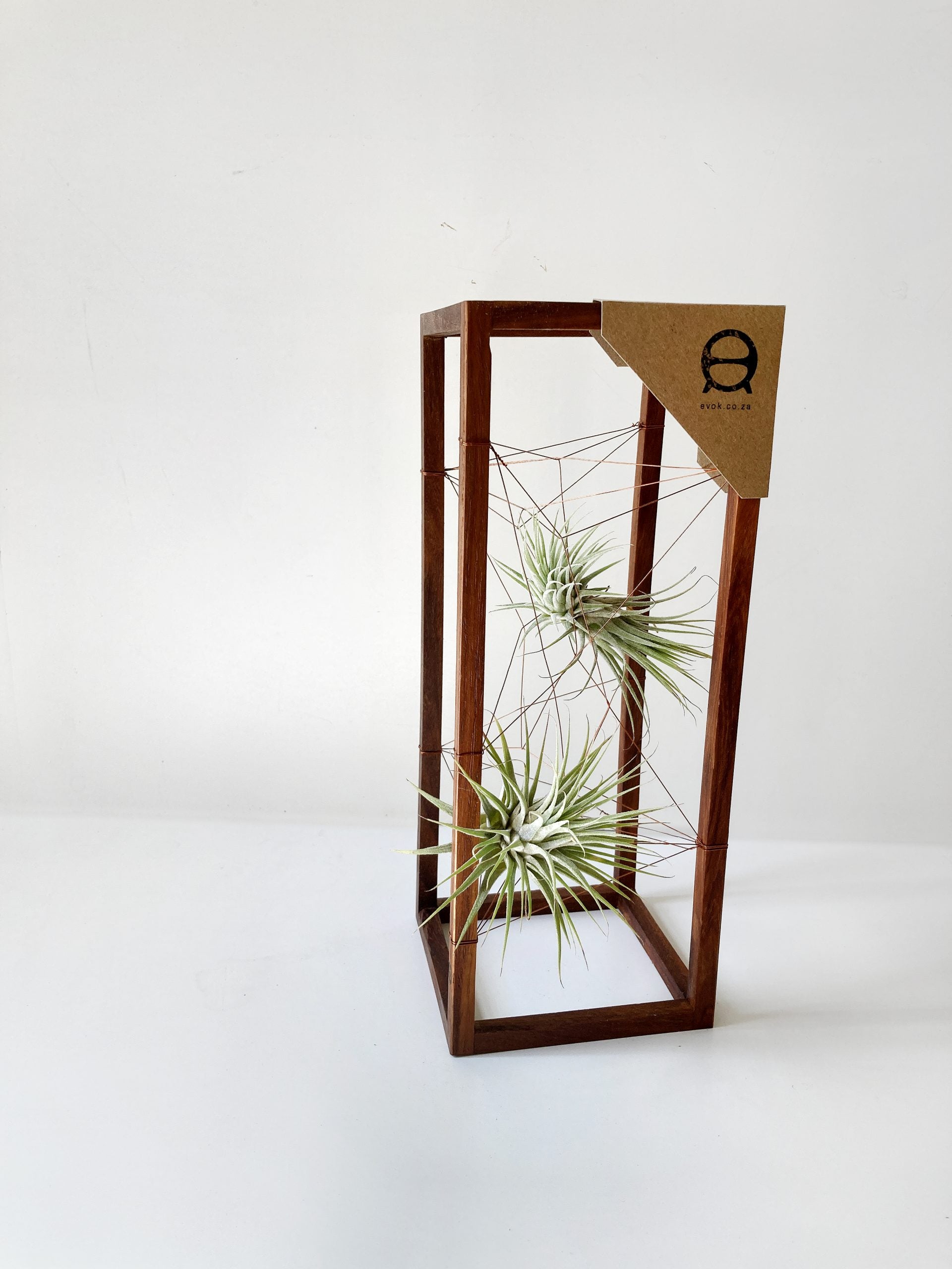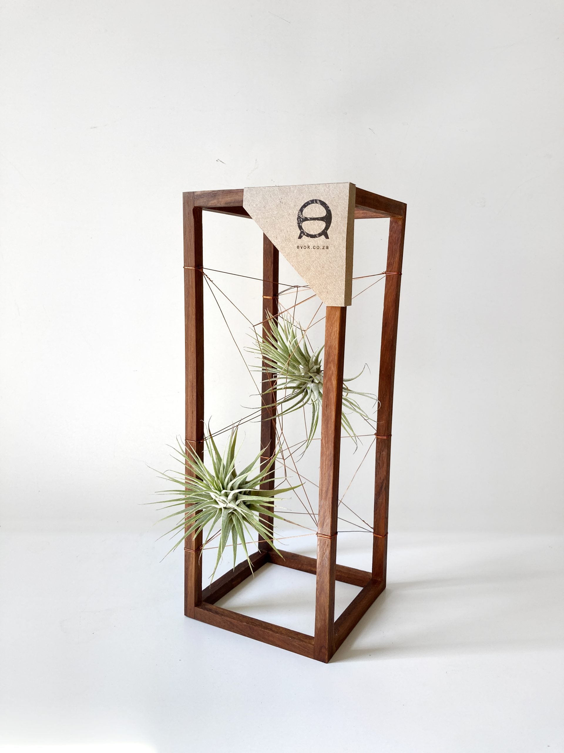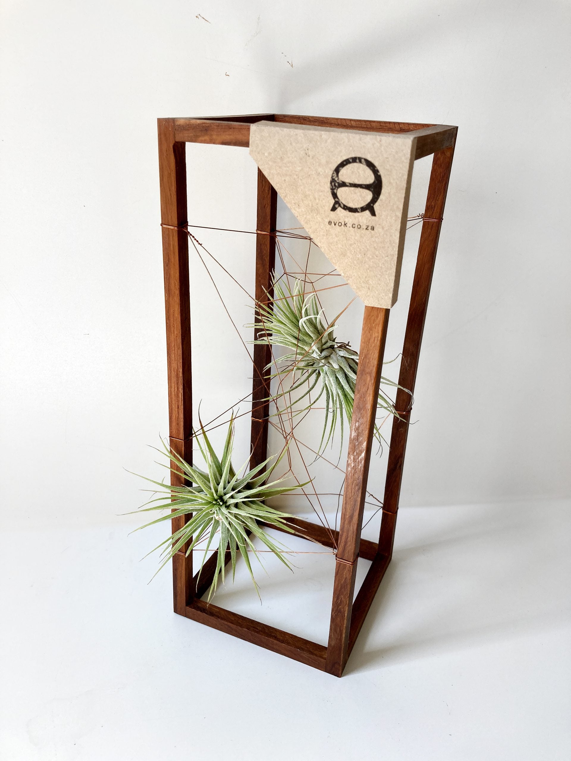 Each frame is handcrafted from Kiaat, a durable and richly grained hardwood used in fine furniture, paired with coated copper wire that delicately suspends the plant in space. The form follows the Golden Ratio, echoing the harmony found in nature and design.