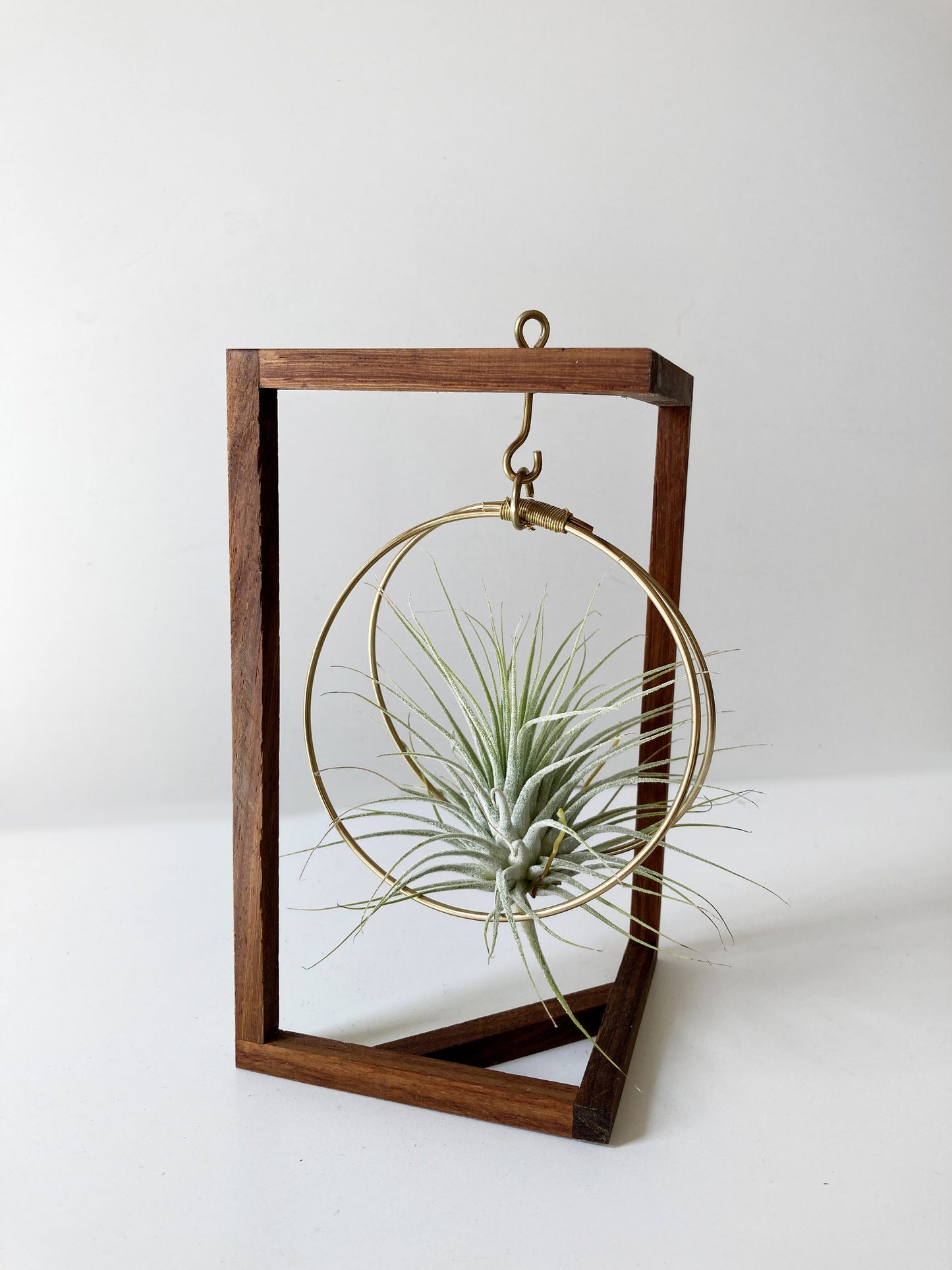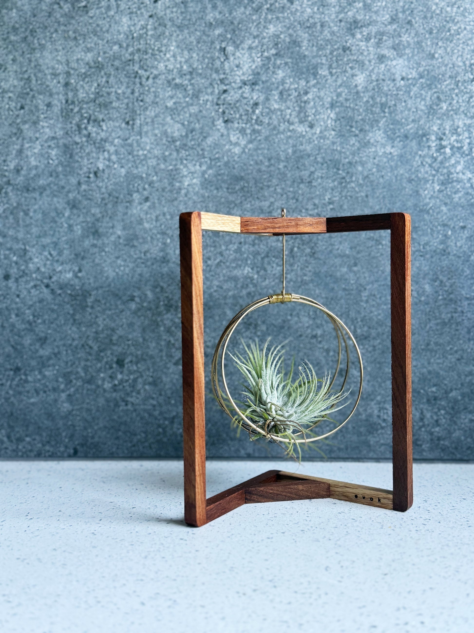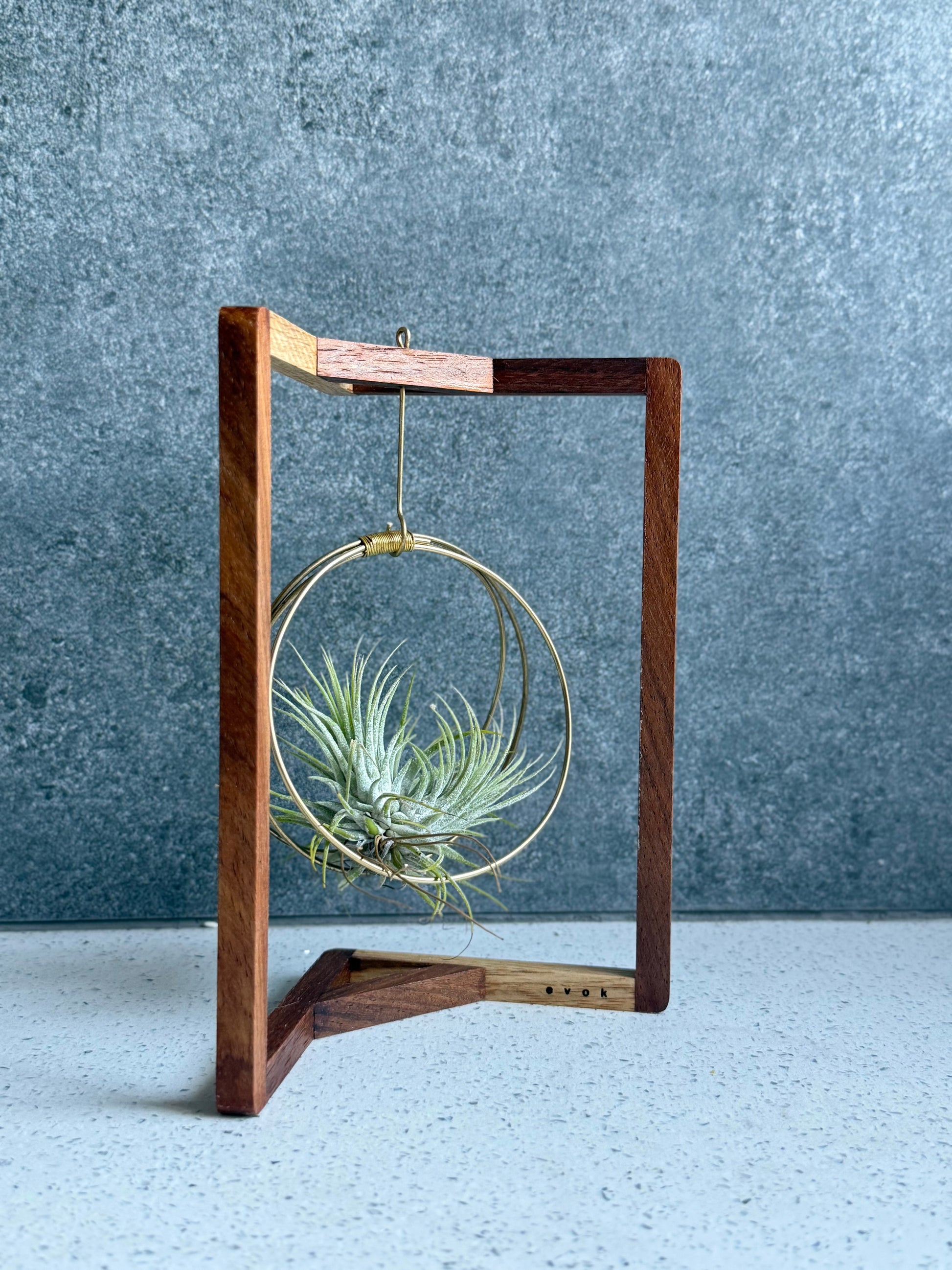 Crafted from brass and Kiaat hardwood, this piece combines warmth, strength, and elegance. The air plant rests gently on a brass swing that hangs within a solid wooden frame — and when misted, it responds with a soft, natural sway.