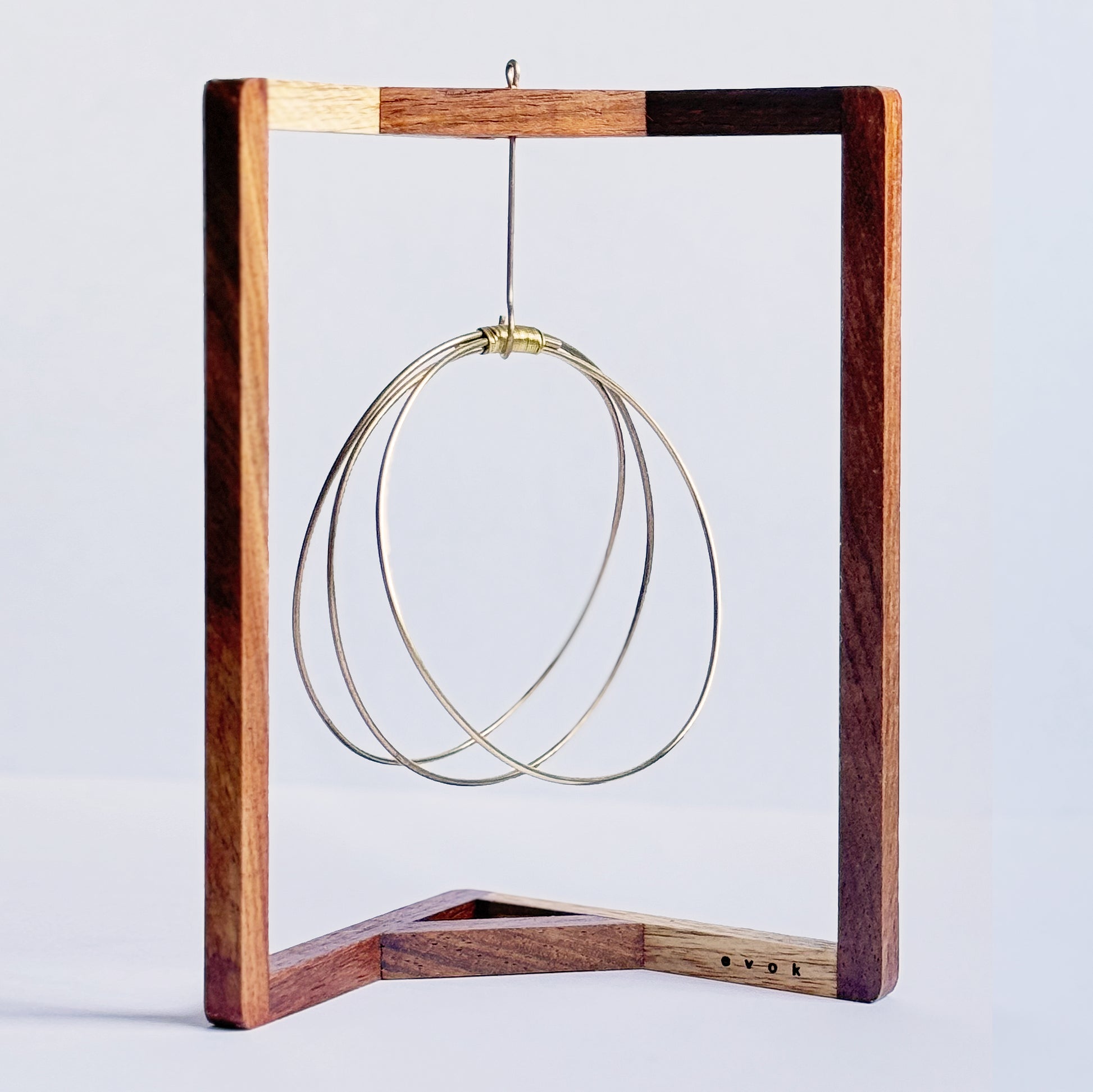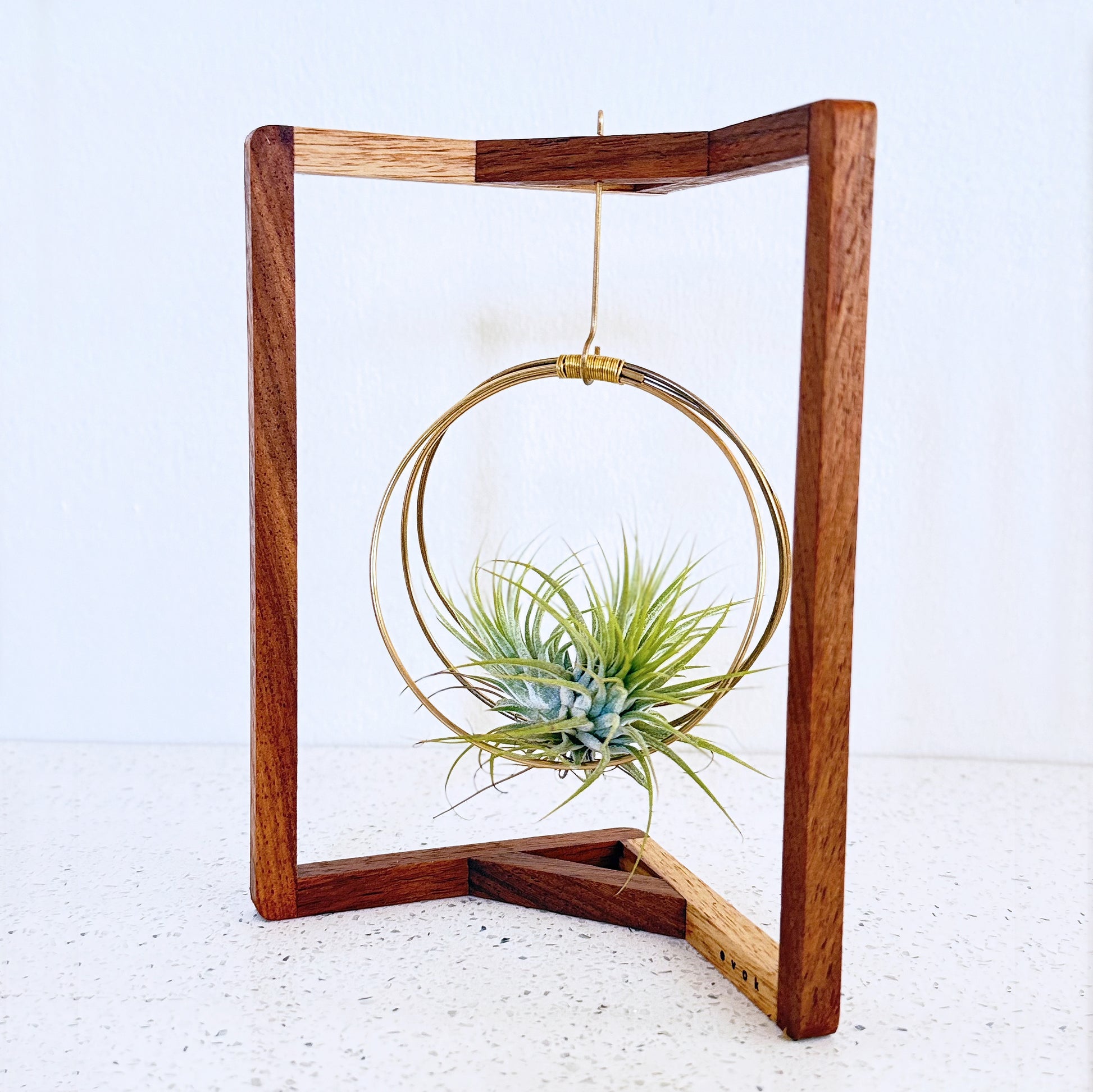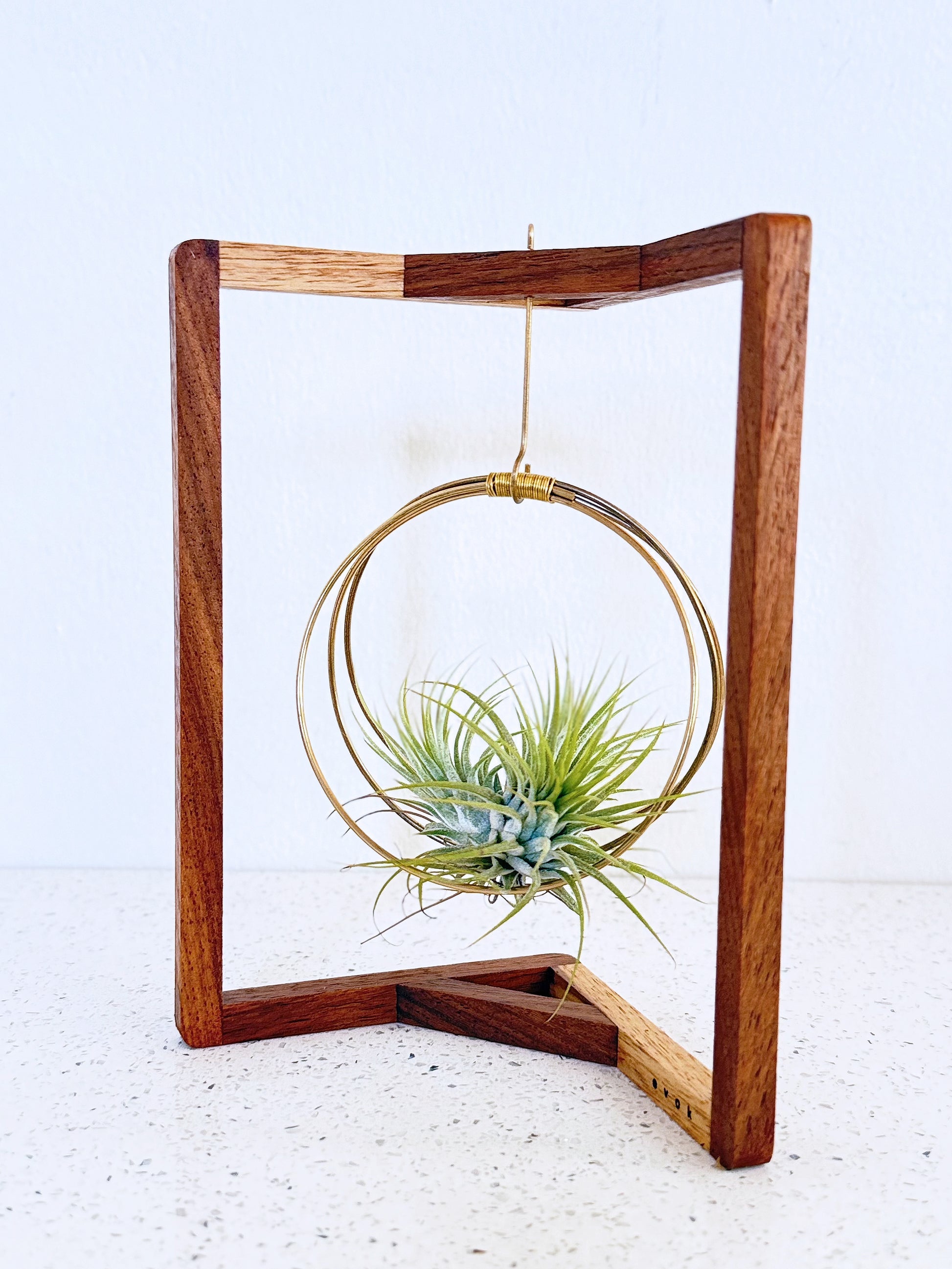 Crafted from brass and Kiaat hardwood, this piece combines warmth, strength, and elegance. The air plant rests gently on a brass swing that hangs within a solid wooden frame — and when misted, it responds with a soft, natural sway.