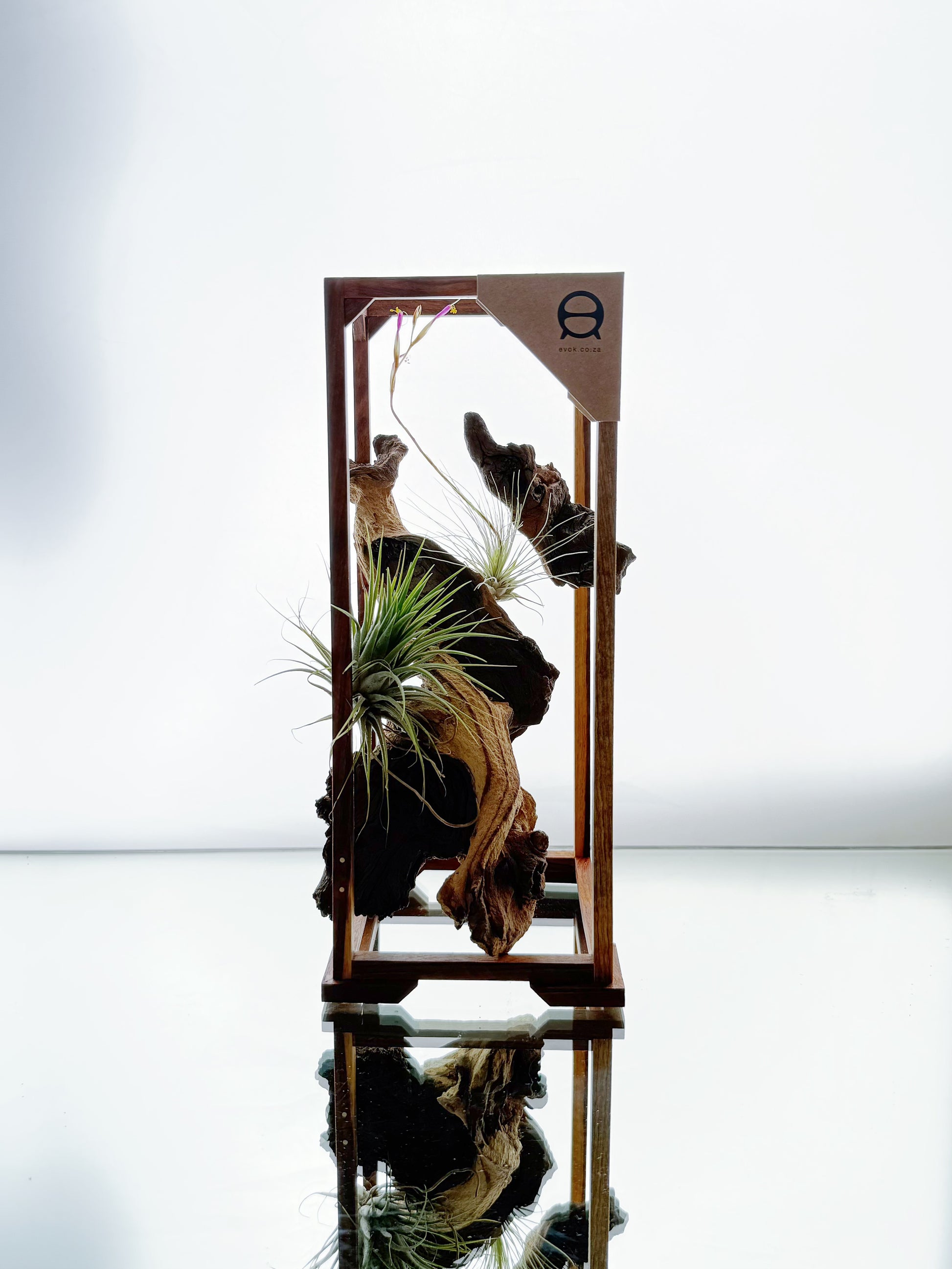 Elevate your space with the AirBonsai – Large, a harmonious blend of nature and craftsmanship. This living sculpture features a Tillandsia (air plant) gracefully suspended within a handcrafted frame. The structure is meticulously constructed from rich Kiaat hardwood, complemented by a brass rod and a unique driftwood centerpiece—each piece telling its own story from land and sea.